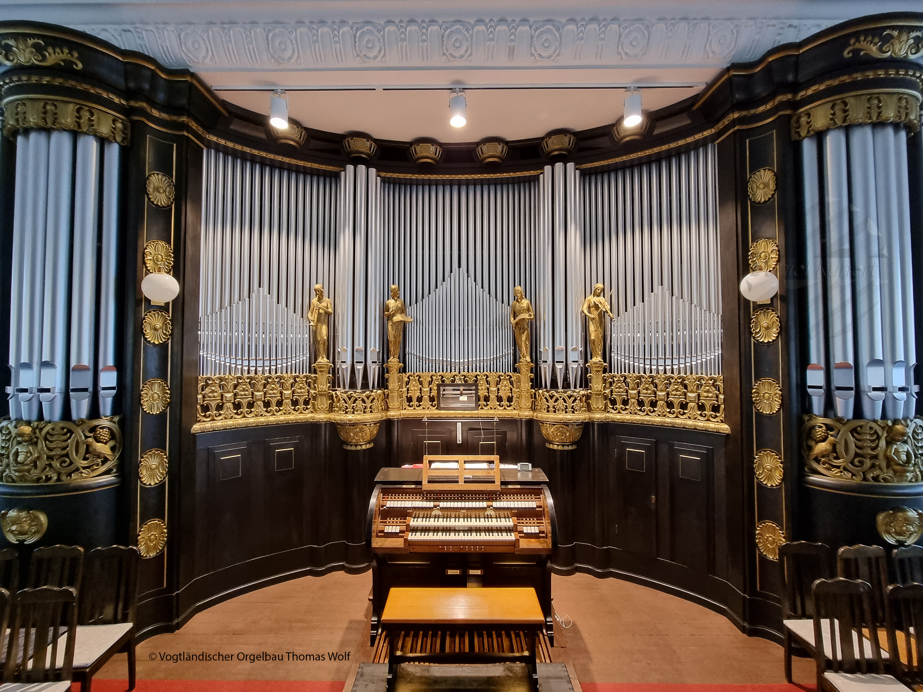 Ihr Jugendstil-Prospekt ist mit vier schlanken, musizierenden Frauengestalten verziert. Die Schnitzarbeiten stammen vom Dresdner Bildhauer Viehweg.